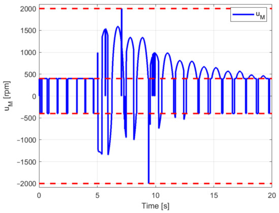 The control actions driving the AUV actuators and computed by the TA policy are shown in Figure 4 that shows the main thruster control signal with respect to the saturation and backlash characteristics of the actuator. This reveals that the control signal managed by the TA satisfies the saturation (±2000 rpm) limit values and is adjusted to values (±400 rpm) due to the backlash. The main thruster control signal jumps between the limits of the backlash zone (±400 rpm), as defined in the control policy. When the MPC controller computes a large control effort to be provided by this thruster, the TA policy maps it into a control signal satisfying the saturation max/min constraints (e.g., at time s).