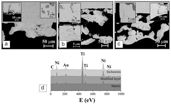 - Meisner, L.L.; Markov, A.B.; Proskurovsky, D.I.; Rotshtein, V.P.; Ozur, G.E.; Meisner, S.N.; Yakovlev, E.V.; Poletika, T.M.; Girsova, S.L.; Semin, V.O. Effect of inclusions on cratering behavior in TiNi shape memory alloys irradiated with a low-energy, high-current electron beam. Surf. Coat. Technol. 2016, 302, 495–506. [Google Scholar] [CrossRef]