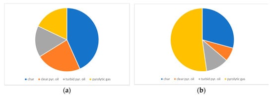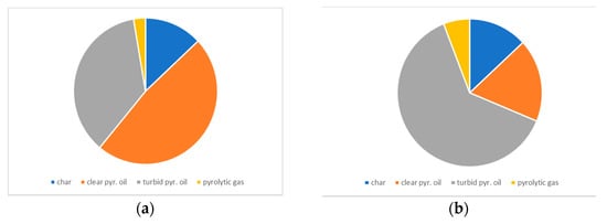 For contaminated foils, the percentage distribution of nitrogen in the substrate and products is as follows: input—0.390%, pyrolytic gas—0.393%, char—0.900%, in the separated oil fraction—0.202% in the clear substance and 0.321% in the turbid fraction. Taking into account these results, the nitrogen migration is as follows: 17.91% is discharged with pyrolytic gas, 43.31% with char and 38.78% with pyrolytic oil (22.84% with clear oil and 15.94% with turbid oil). These results are presented in Figure 3a.