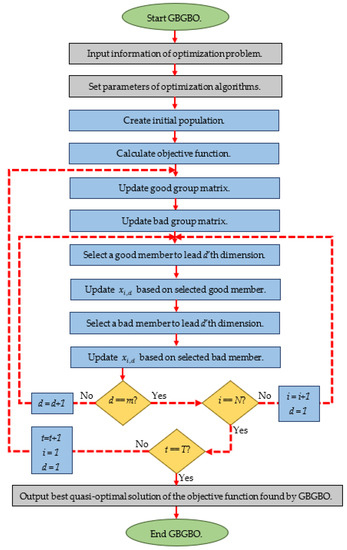 After all variables of all population members were updated based on Equations (5) and (6), the algorithm process was repeated until the stop condition was reached. Then, after the end of the algorithm iterations, the best solution obtained using the BGBGO was presented. Figure 1 shows the implementation of the BGBGO as a flowchart.
