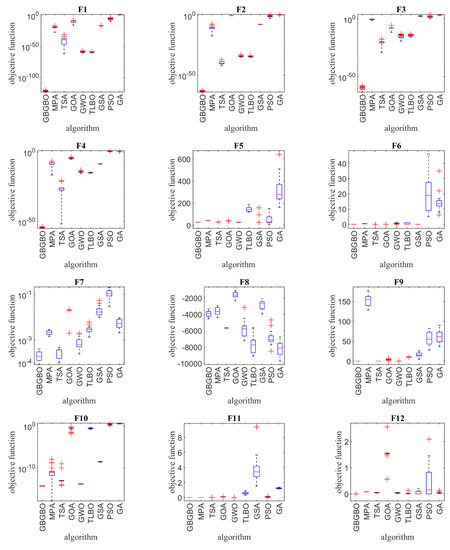 Seven objective functions F1 to F7 were selected as unimodal objective functions to evaluate the performance of the GBGBO and other algorithms. Complete information on these objective functions is given in Table A1 in Appendix A. These objective functions had only one optimal solution and were therefore suitable for evaluating the exploitation power of optimization algorithms. The results of the optimization of these objective functions after twenty independent implementations are presented in Table 2. The optimization results of these objective functions showed that the proposed GBGBO offered better solutions than other algorithms. This indicates that the GBGBO had a high exploitation power in achieving the optimal solution.