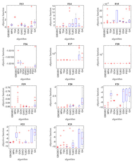 Optimization results of the F1 to F23 objective functions using the proposed algorithm and eight other optimization algorithms are presented in Table 2, Table 3 and Table 4. The boxplot of results for each algorithm and objective function are drawn in Figure 2 for further analysis and visual comparison of the performance of the optimization algorithms. Based on the boxplots shown in Figure 2, in the unimodal objective functions type F1, F2, F3, F4, F6, and F7, the superiority of the GBGBO over the other eight algorithms is obvious. The function F5 of the GWO offers better performance. However, the GBGBO offers acceptable performance with little difference to the GWO. In the functions F9, F10, F11, F12, and F13 of the high-dimensional multimodal objective functions type, the GBGBO is the best optimizer among the review algorithms. In the objective function F8, the GA presented better performance. In the functions F14, F15, F16, F18, F19, F20, F21, F22, and F23 of the fixed-dimensional multi-model objective function type, the proposed algorithm could provide a more efficient quasi-optimal solution with smaller values of standard deviation. The function F17 in the GWO offers better performance. However, the GBGBO offers acceptable performance with little difference to the GWO.