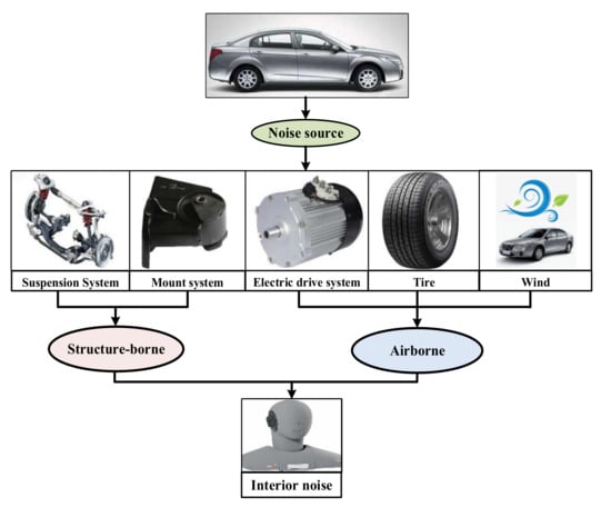 Many factors contribute to the noise in a PEV. As each noise source has its own transfer path and transmission mode, the transfer path of the noise in a PEV is particularly complicated. However, the noise transmission is divisible into only two categories: structure-borne noise and airborne noise. Structure-borne noise is caused by vibrations of a component in the vehicle, which are transmitted to the car body through the connected parts. The resulting vibrations of the vehicle body panel radiate into the cab. Airborne noise arises from the vibrations of each noise source or from internal noise excitation, which radiates noise into the air. The airborne noise is transmitted to the surroundings and then reaches the vehicle through other paths such as body panels, holes, gaps, or windows. If the PEV is operating under linear time-invariant conditions, the sound pressure around the human ear in the vehicle can be obtained by superposing the energy of each noise source transmitted to the vehicle. Before reaching the ear, the energies of the excitation sources are attenuated by the structures and air transmissions along the different transmission paths. The sound pressure in the PEV is; thus, calculated as