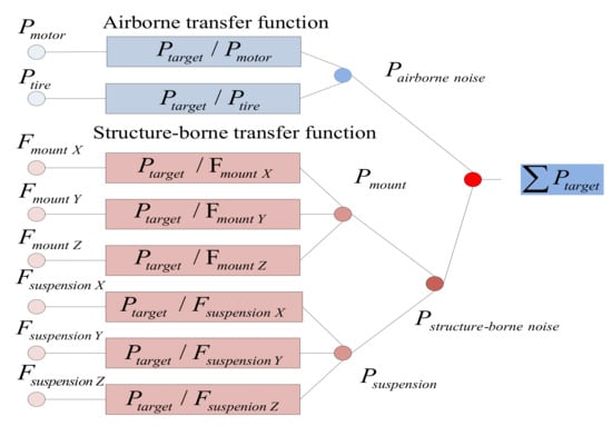 where denotes the total noise pressure in the vehicle; i and j are the indices of the airborne and structure-borne noise sources, respectively; and are the pressures of the airborne noise sources and the jth structure-borne noise sources, respectively; and are their corresponding transfer functions; is the airborne noise source excitation; and is the structure-borne noise source excitation.