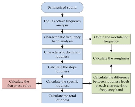 Sound pressure is the most basic physical quantity to quantitatively describe sound waves, where parameters, such as sound pressure, sound intensity, and sound power, among others, are typically considered when describing the physical characteristics of noise. However, these parameters cannot reflect the subjective feelings of a person; hence, objective psychoacoustic parameters have been developed on the basis of considering the auditory characteristics of the human ear as well as fully reflecting subjective feelings [1]. Psychoacoustic parameters have been identified as objective physical quantities that describe the degree of difference in subjective feelings caused by different sound signals and which can eliminate the unstable factors of subjective evaluations. At present, the more commonly used parameters are loudness, sharpness, and roughness [22]. After we obtained the synthesized sound in the vehicle, we could objectively analyze the SQ of the synthesized sound in each transmission path according to the process in Figure 3.