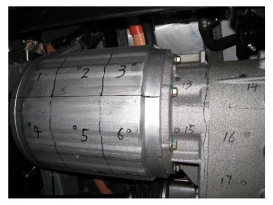 The noise transfer function of the electric drive system was measured using the airborne source quantification (ASQ) technique. The ASQ technique quantifies airborne noise sources by determining the contribution level of each noise transfer path. To this end, it considers the transfer path between each noise source and the response at the target point [27]. ASQ can accurately measure the contributions of surface-plate noise sources to the total noise [28]. The noise source excitation characteristics are described in terms of volume acceleration or volume velocity, and the response at the target point is indicated by the sound pressure measured by a microphone [29]. As the electric drive system cannot be treated as a single sound source, its surface was divided into several equal-area meshes. Each grid was considered equivalent to a point source, and its intensity was determined as the acceleration at the center point of the mesh multiplied by the surface area of the mesh. In the general meshing principle, the spacing between the mesh centers is less than half the wavelength of sound waves with the corresponding frequency. However, even when the mesh density does not meet these requirements, ASQ is more accurate than traditional measurements of the airborne noise transfer function (in which volume source measurements are separately collected on each surface of the electric drive system). In this measurement, the electric drive system was divided into 61 squares of side length 8.5 cm, as shown in Figure 4.