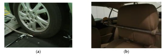 Measurement position of noise transfer path function of the left front tire: Layouts of (a) the microphone and volume sound source at the left front tire and (b) the microphone placed at the driver’s right ear.