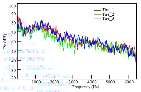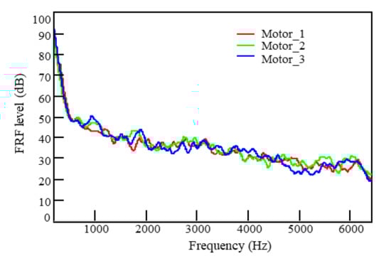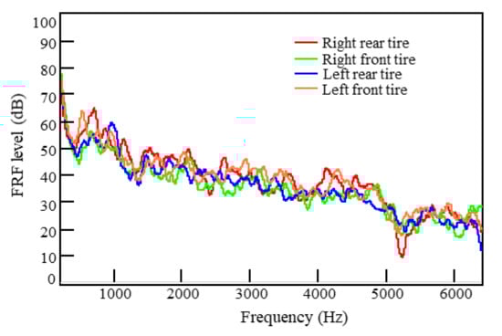 Figure 6 displays the spectra of the airborne noise transfer functions from Points 1, 2, and 3 on the motor surface to the target point. Since the amplitude of FRF varies greatly, the Y-axis values are displayed on the dB scale. The dB scale can clearly express the huge changes of amplitude. At the different surface measurement points, the airborne noise transfer functions showed almost the same trends, with a gradually decreasing sensitivity as the frequency ranged from low to high. The peak frequencies of the noise transfer functions differed among the measurement points, but the differences were ignorable. Figure 7 shows the airborne transfer function spectra of the four tires to the target point.