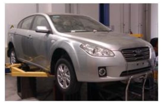 After measuring the transfer function of the transfer path of each noise source to the target point in the vehicle, we must obtain the working excitation of each noise source under actual driving conditions. The excitation data of each noise source were collected in a hub test bench of the vehicle semi-anechoic room. In this environment, the test error is reduced, and the noise influences of wind and the external environment are removed. The vehicle was assumed to be driving at a constant speed under steady-state conditions. During the test, the time domain signal was collected in the 20–60 s period, when the vehicle speed had stabilized. The vehicle and each piece of the test equipment were assumed to operate properly. The data were collected at the target point, noise source excitation point, reference point, and noise-signal phase-reference point in the vehicle. The exciting forces of the mount and suspension systems were obtained using the inverse-matrix method, and the acceleration signals were measured at reference points arranged near each noise source point (where the number of reference points was twice the number of noise source points). The tire excitations were also obtained by the acoustic inverse-matrix method. For this analysis, the sound pressure signals were checked at three reference points near each tire. As the noise transfer functions of the electric drive system were determined by ASQ, they did not require reference points, but a unidirectional acceleration sensor was placed at the center of each noise source point in the electric drive system.