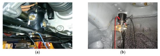 Positions for measuring the transfer path functions of the mount and suspension: Layouts of (a) the acceleration sensor at the mount and (b) the exciter at the suspension.