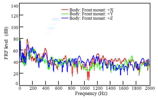 Figure 10 shows the transfer functions of the excitation point of the front mount to the target point of the vehicle in all three directions. As the transfer function became very weak after 500 Hz, only the data between 0 and 500 Hz were collected for analysis. The transfer function peaked at 10 and 120 Hz. The largest peak was found at 120 Hz. Generally, the most concerning frequencies of interior structure-borne noises caused by the electric drive system were within 300 Hz.