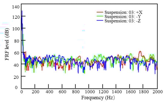 Figure 11 shows the transfer functions of the front connection of the left rear suspension spring in the three directions to the target point in the vehicle. Since the road test has not been conducted yet, the magnitude of each transfer path excitation source cannot be determined and the sensitivity of the transfer functions can only be analyzed and compared from the test data. Generally, the most concerning frequencies of structure-borne noise in the vehicle caused by the suspension were within 1000 Hz.