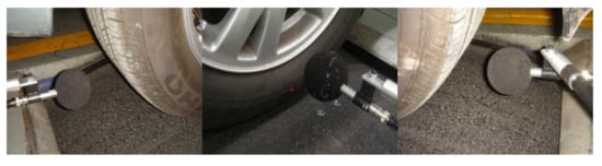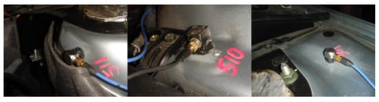 Measurements of structure-borne noise source excitation were performed in the same measurement environment under the same standard as the airborne noise source excitation. The noise source excitations of the mount and suspension systems were obtained using the inverse-matrix method, necessitating the arrangement of several vibration acceleration sensors near each structural-sound excitation source. Figure 16 and Figure 17 show the arrangements of the noise source excitation points on the mount and suspension systems, respectively. Structure-borne source excitation measurement equipment is shown in Table 4.