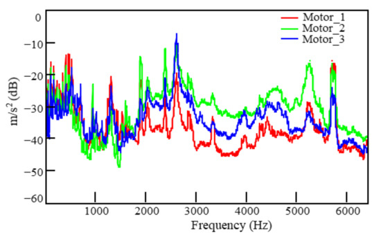 Figure 14 shows the frequency spectra of the excitation signals at Points 1–3 on the motor surface under the 50 km/h working condition. The spectra peaked at 475, 1426, 2375, 2851, 5227, and 5703 Hz. Figure 15 shows the frequency spectra of the three-point excitation signals of the left front tire under the 50 km/h working condition. These spectra peaked at 1000–1700 Hz, and the sound pressure slowly decreased as the frequency increased beyond 1700 Hz.