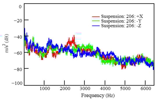 Excitation spectra on the front of the left rear suspension spring (in three directions from Connection Point 206).