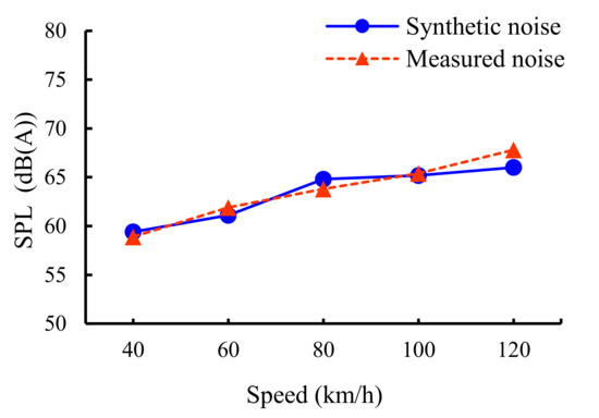 Since the transmission path of noise does not change, that is to say, the transfer function does not change with the working conditions, we only need to measure the sound source excitation under different working conditions and put it into the established sound synthesis model to predict the sound in vehicle. As shown in Figure 21, the noise-sound pressure levels in the synthesized vehicle interior at different operating speeds closely matched the measured results. This result indicates the high prediction accuracy of the established synthetic equivalent model. Particularly, the synthesized and actual noise spectra displayed very similar characteristics, guaranteeing the accuracy of the subsequent SQ analysis.