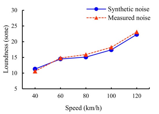 Comparison of synthetic and measured noise loudness at different operating speeds of the PEV.