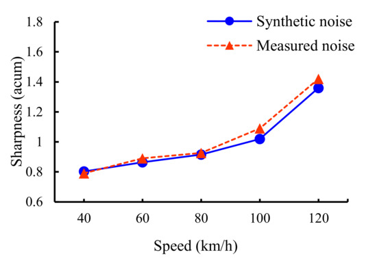 Comparison of synthetic and measured noise sharpness at different operating speeds of the PEV.