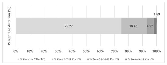 The results show that the majority of the distance (80%) is covered standing–walking (43.51%) and jogging (36.58%). The remaining 20% of distance is performed running (14.68%), and only 5.23% is spent sprinting. From a duration perspective, 93.67% of the time is invested standing–walking (75.22%) and jogging (18.43%). During the remaining 6.66% of play time, athletes are running (4.77%) or covering distance over 18 Km h−1 (1.89%).