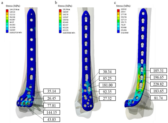 The von Mises stress distribution for three different bone plates and maximum von Mises stress around the screw hole. (a) Aplus ADLT bone plate, (b) Synthes 3.5 mm ADT bone plate, and (c) Synthes 3.5 mm MDT bone plate.