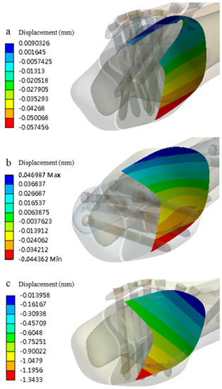 The z-axis tibia fracture surface displacement (a) Aplus ADLT bone plate groups, (b) Synthes 3.5 mm ADT bone plate groups, and (c) Synthes 3.5 mm MDT bone plate groups.