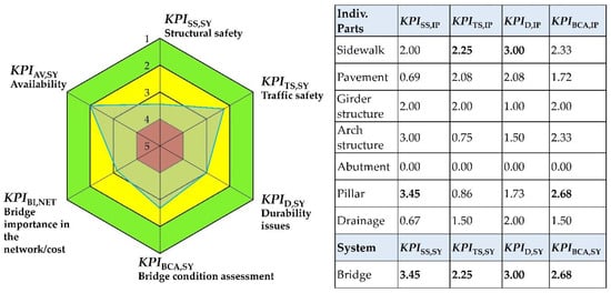 The entire assessment procedure (described in Section 2.1, Section 2.2, Section 2.3, Section 2.4 and Section 2.5) is systematized in the flowchart in Figure 1. Based on the assessment by visual inspection and weighting across the component, system, and network levels, a set of the six most important key performance indicators is revealed. The graphical representation in the form of a colored spider is constructed (see Figure 3). Green areas related to structural safety, traffic safety, durability, or bridge condition assessment represent the most favorable rate and red areas should alert the bridge operator and require immediate intervention []. Green or red regions related to availability and importance indicators become relevant as soon as the bridge needs maintenance. The green color for the availability indicator KPIAV,SY means that “no problem is expected” or “good performance is expected during maintenance” while the red color, in this case, indicates that availability issues will occur during the maintenance of a particular bridge. Colors related to the importance indicator KPIBI,NET are not crucial for a particular bridge, but later on, when compared with the importance indicators for other bridges in the network, may influence the decision on the priority of repair. In addition to the radar diagram, a tabular representation of the most influential individual parts for the overall bridge KPIs is anticipated.
