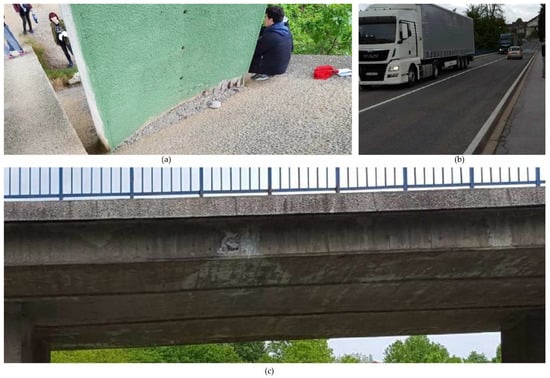 Most significant damages to Slunjčica Bridge []: (a) concrete cover fraction and reinforcing steel corrosion at the pier due to the insufficient concrete cover and poor construction; (b) sidewalk block cracking probably due to vibration and poor construction concrete; (c) cover fraction and reinforcing steel corrosion at the slab bottom due to insufficient concrete cover and efflorescence appearance due to wetting and probable damage in waterproofing. Reprinted with permission from ref. []. 2019. IABSE.