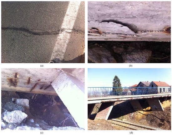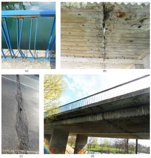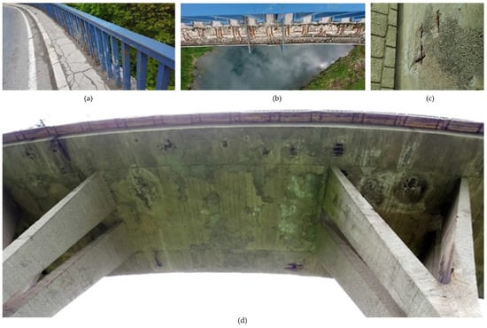 Most significant damages to Rastoke Bridge []: (a) degradation of corrosion protection coating of the pedestrian fence due to poor protection and lack of maintenance; (b) breakage of the concrete cover and reinforcing steel corrosion of the cornice due to freezing and thawing; (c) segregation due to poor concreting and reinforcing steel corrosion leading to a concrete spalling at the bottom slab next to the abutment; (d) delamination of the concrete cover and efflorescence at the bottom of the slab due to wetting and probable damage in waterproofing. Reprinted with permission from ref. []. 2019. IABSE.