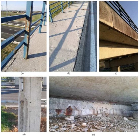 Most significant damages to Gradna Bridge []: (a) corrosion of the pedestrian fence; (b) sidewalk plucking out due to inadequate pavement mixture and curb erosion along the bridge due to poor construction and vibrations; (c) wetting of the prefabricated cornice; (d) wetting and delamination of the concrete of the pier due to improper drainage execution and performance; (e) leakage, wetting, and delamination of the abutment due to water leaking at the expansion joint. Reprinted with permission from ref. []. 2019. IABSE.