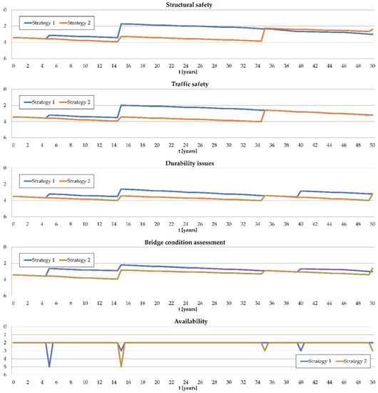 Evolution of key performance indicators (KPIs) in time for two maintenance strategies—Bjelovar Bridge example. Reprinted with permission from ref. []. 2019. IABSE.
