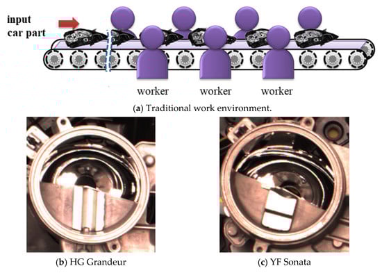 The traditional work environment for manufacturing a conventional vehicle headlight is shown in Figure 1a. It is an environment in which several workers assemble two or more headlight parts in one conveyor system. The worker determines the vehicle type of the headlight and selects the parts to be assembled. However, in the case of some parts, the structure of the headlights is similar, as shown in Figure 1b,c, which may result in errors in the assembly process.