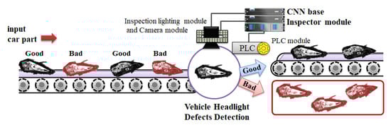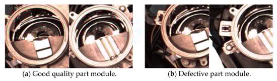 Manufacturing systems are progressing with the advancements in the industry. The core technologies used in manufacturing systems can be classified into machine vision technology, industrial robot control technology, industrial PC technology, programmable logic controller (PLC) technology, and sensor technology. Among them, machine vision technology is thought to be an important technology, able to either reduce production costs or improve productivity [1,2,3,4,5,6]. In this paper, we adopt machine vision technology to detect incorrect parts (called defects) occurring during the assembly process.