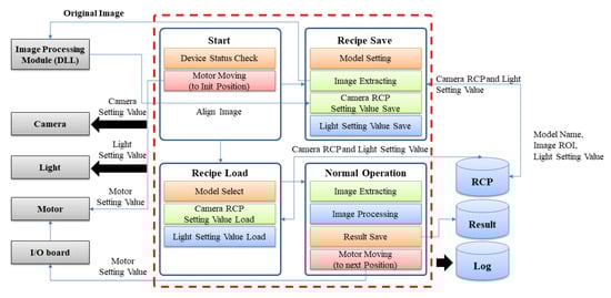 In order to judge the defect, the recipe must be saved by executing the system first. The recipe (information on inspection regions, camera settings, lighting brightness settings, and so on) of a vehicle type is saved by the recipe save module in Figure 3 after executing the start module, which checks the status of the equipment in terms of system operation and sets the motor’s default position. After saving the recipe, the system is run again to perform the defect determination process. In this process, the start module is executed first through which a vehicle model (or type) for inspection is determined and then the motor is moved to the inspection position of the vehicle type. Then, some values for the camera and the light settings are loaded from the recipe load module and transferred. Afterward, the defect is judged by the normal operation module. The normal operation module is a module related to the actual model classification and inspection, which returns the inspection result and stores it for a history search in the database.