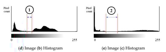 When a vehicle headlight image is captured using the inspection lighting (Figure 5a), there is a shadow due to the structure of the headlight. Thus, the color distribution in the histogram is skewed to one side (Figure 5d) when binarization is performed based on the gray-scale image [16]. Consequently, the interval to be set as the threshold value narrows (Figure 5d ①). Moreover, three threshold values need to be selected when using the hue-saturation-value (HSV) model in order to minimize the influence of light. Only one threshold can be used instead of three since the likelihood and normalization are applied after changing the red-green-blue (RGB) model to the HSV model to minimize the influence of light. As such, a wider threshold setting interval than the gray-scale, image-based setting interval should be used in the proposed method.