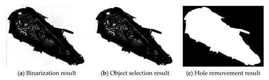 After binarization, the object is acquired—as shown in Figure 6b—by applying a flood fill [17] to remove the noise in the background, as shown in Figure 6a. The reference coordinates of the inspection target are required in order to apply the flood fill, and the worker inputs these directly when setting the recipe. There is an internal hole in a headlight, which needs to be removed since it may affect feature extraction. To this end, the internal hole is removed using the same method as extracting the background, and OpenMP is used to shorten the operating time.