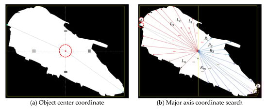 In terms of the major axis coordinate search of the object, the distance from the center of the object to the coordinate of the object with left and right pixel values of 1 is calculated, as shown in Figure 7a, after calculating the center coordinate of the object using its upper left (e.g., ⓐ) and lower right (e.g., ⓑ) coordinates, as shown in Figure 7b. The left and right major axis coordinates of the object are obtained by finding the coordinates with the greatest distance value, among the calculated distances, to the left and right pixels. This process is expressed by Equations (3) and (4).