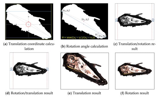 The image translation and rotation method comprise a total of three steps. The first step is the calculation of the rotation angle and the translation coordinate. The second step is the image translation transformation, and the last step is the image rotation transformation. In the first step, the translation coordinate is the distance from the center of the major axis to the image center coordinate, and the rotation angle is the angle at which the major axis will rotate. The translation coordinates are calculated by first obtaining the center coordinates (()/2, (where and are the coordinates of the left and right end points of the major axis—and then finding the difference between this central coordinate and the image central coordinate, as shown in Figure 8a. The angle at which the image is to be rotated is calculated using the following equation , as shown in Figure 8b.