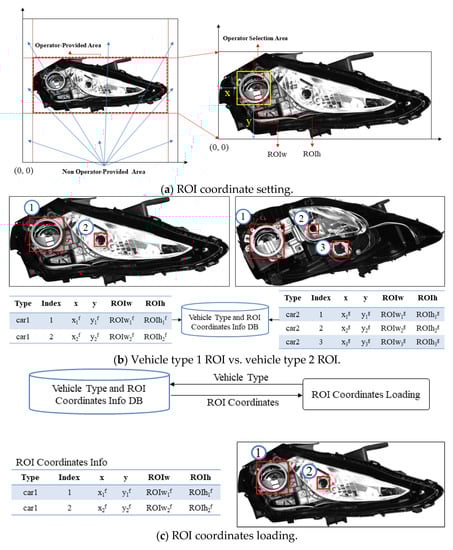 Since the structure of the headlights for each vehicle type is different, the location of the inspection region, the number of inspection targets, and the size of the inspection region are configured differently, as shown in Figure 9b. Therefore, the size or the number of the region and position coordinates cannot be designated identically when setting and storing the inspection region. In this study, the database and input screen are configured to individually designate and manage the inspection region information and reference images for each model.