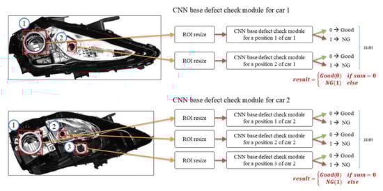 It was found that the ROI position and size to be detected for defects were different depending on the vehicle type, and the ROI size was different for the same vehicle type. Therefore, the CNN model was constructed for each ROI of the vehicle type, and the presence of defects (Good = 0, NG = 1) was detected for each model, as shown in Figure 11. Finally, the vehicle headlight was determined to be good after tallying the result of each model if the sum is zero, and, as NG, if the result’s sum did not equal zero.