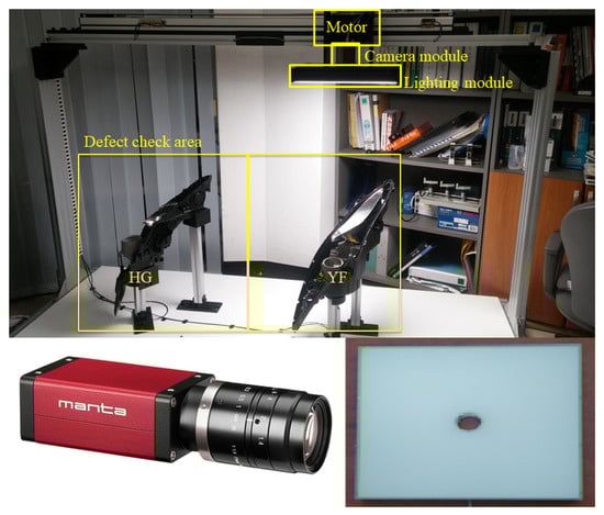 For the purpose of this experiment, the hardware for detecting defects was constructed, as shown in Figure 12. The lighting used for image shooting was a flat LED light with a diffuser plate attached to the camera and mounted in the center. The images were acquired by placing the camera, lens, and light vertically, and shooting from above. The camera and lens specifications are summarized in Table 2. One sample was used for each of the two vehicle types during image acquisition, and 100 images were acquired for each, thereby, acquiring a total of 200 images.