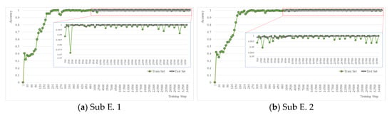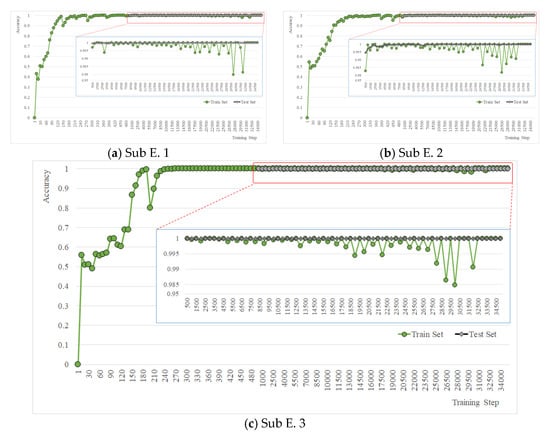 In the E. 2 (three-class) detection experiment, which was the second experiment, the result of Sub E. 1 showed an accuracy of 0.97 or higher (after 500 steps) regardless of the training step for both the training set and the test set, as shown in Figure 15a. The highest accuracy in the training step was 1.00 for both the training set and the test set, and the lowest accuracy was 0.9717 for the training set and 0.9978 for the test set. In addition, the results of Sub E. 2 showed an accuracy of 0.9894 or higher, as shown in Figure 15b. The highest accuracy in the training step was 1.00 for the training set and 0.9999 for the test set, and the lowest accuracy was 0.9894 for the training set and 0.998 for the test set.