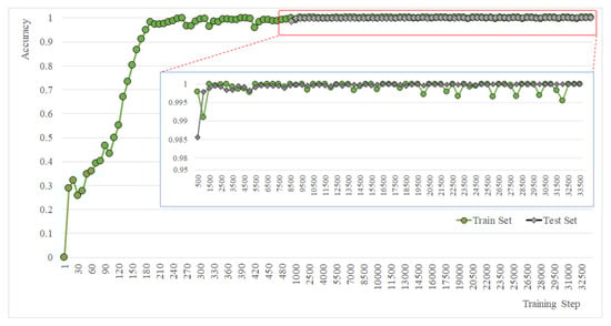 The result of E. 3 (4-class), which was the third experiment, showed an accuracy of 0.98 or higher (after 500 steps) regardless of the training step for both the training set and the test set, as shown in Figure 16. The highest accuracy in the training step was 1.00 for both the training set and the test set, and the lowest accuracy was 0.9909 for the training set and 0.9856 for the test set.