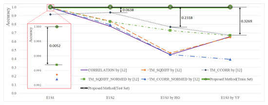 For the YF model, which was the first experiment, the results of detecting high quality images and defective images are shown in Figure 17 E1S1. The proposed method showed a classification performance of 1.00, whereas the existing method showed a classification performance of 0.9948 (TM_SQDIFF_NORMED). For the HG model, which was the second experiment, the results of detecting high quality images and defective images are shown in Figure 17 E1S2. The proposed method showed a classification performance of 1.00, whereas the existing method showed a classification performance of 0.9363 (TM_CCORR). For the HG and YF model detection, which was the final experiment, the results are shown in Figure 17 E1S3 (by YF and HG). The proposed method showed a classification performance of 1.00, whereas the existing method showed a classification performance of 0.6731 (by YF, TM_CCORR) and 0.7683 (by HG, TM_CCORR). As shown in the results of this experiment, it was found that the performance of the method proposed in this paper exhibited an improvement of 0.1569 (average) when compared with the existing method.