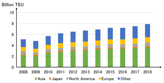 Free trade agreements (FTAs) and economic partnership agreements (EPAs) to eliminate tariffs between countries and regions continue to grow in number with progress in trade liberalization [1]. There has been an annual increase in the scale of cross-border electronic commerce (EC), which includes trading on online shopping sites across national borders. The EC market is projected to grow at an annual rate of 27% by 2027 [2]. The impact of these factors has made international logistics between countries and regions increasingly active. Figure 1 shows annual increases in the number of containers, in terms of twenty-foot equivalent units (TEU), handled in harbors around the world, where there was a 1.5-fold increase in the number of containers during the decade from 2008 to 2018 [3]. In particular, marine transportation accounts for approximately 90% of the total volume managed in international logistics and plays a vital role in the supply chains of many companies [4].