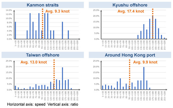 As discussed in Section 2.1, Alessandrini et al. used data on the departure and destination ports from operation data on the same vessel to calculate the average voyage speed. However, future weather conditions were not considered despite their potential effect on the voyage speed. The voyage speed also varies with the transit area, such as harbor, offshore, and strait, examples of which are shown in Figure 2. This figure is a graph created using Marine Traffic operation data on the voyage speed distribution of vessels around the Kanmon Straits, Kyushu, Taiwan, and Hong Kong ports in November 2019. The vertical axis depicts the percentage of vessels that made the voyage at the speed depicted on the horizontal axis. Figure 2 shows vessels travel at a high speed offshore but at a low average speed of 10 knots or less near straits and harbors. Alessandrini et al. did not consider these regional aspects of the voyage speed.