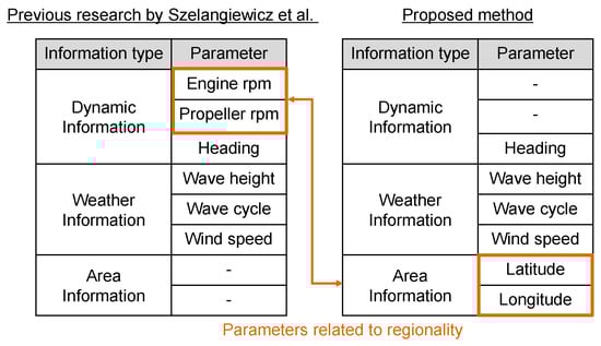 Here, the parameters adopted by Szelangiewicz et al. [19] are used to determine the dynamic information about the vessel and weather information. The parameters for the weather information are the wave height, wave period, and wind speed, while the bow direction is used as the parameter for the dynamic vessel information. Figure 3 shows the main parameters used in this study and in the study of Szelangiewicz et al. Here, our method incorporates the regionality of the voyage speed by replacing the parameters considered by Szelangiewicz et al., such as the number of engine and propeller rotations, with positional information, namely, the latitude and longitude.