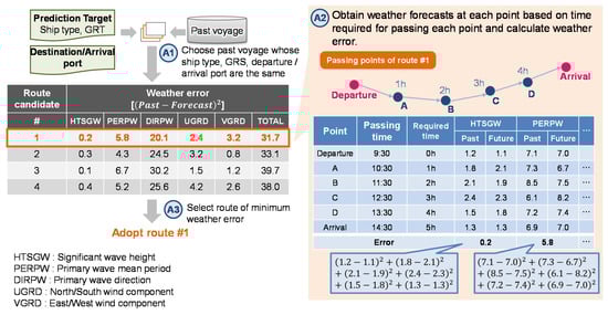 As Hayashi et al. [22] noted, the vessel route for (A) can be freely selected, and captains almost always employ the same selection criteria. Hence, given the influence of weather, a limited number of routes can be selected. We can use this consideration to calculate routes with little deviation from the actual ones; that is, we can analyze the past routes of target vessels and choose those routes whose weather conditions are similar to the current conditions.