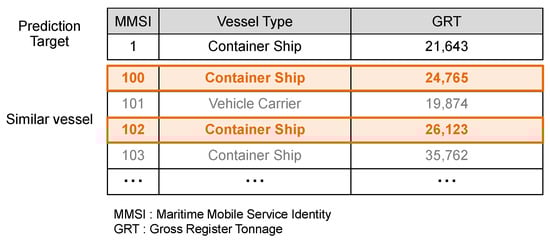 In step A1, routes with the same departure and destination ports are extracted from the data for vessels similar to the considered vessel. Although the use of past data for the same vessel would maximize the prediction accuracy, a sufficient amount of data may not be available for that vessel on the routes. Therefore, data for similar vessels are used in addition to data for the same vessel to ensure a sufficient quantity of data can be extracted. Although it is a challenging problem to identify similar vessels, vessel dimensions (such as the total length or width) can be determined from the vessel type (such as tankers or container vessels), weight, and GRT, as illustrated in Figure 4 [24]. Hence, a route that takes into account the current weather conditions can be extracted from past data for similar vessel types and GRTs. In the illustration, no vessels are found with exactly the same GRT as the considered vessel, so the order of GRT (e.g., 10,000-ton class, 20,000-ton class, or 30,000-ton class) is considered. Figure 5 shows an example where the considered vessel is a container ship with a GRT of 21,643, and data on similar container ships in the 20,000-ton GRT class are selected. In addition, some routes include outliers due to vessel breakdown, accidents, etc. The AIS information includes voyage status, and it can be used to remove routes including abnormal voyage statuses.