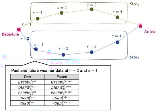 Among the constants presented above, the past wave height, wave direction, wave period, east–west winds, and north–south winds are acquired at the transit time for each site. The future constants cannot be similarly acquired because the future transit time for each site has not been determined. Therefore, the future constants are acquired by approximating the future transit time at each site as the time required to travel between the transit sites in the past. For example, Figure 4 shows that it takes one hour to travel from the departure port to site A; therefore, the future wave height, wave direction, wave period, east–west winds, and north–south winds at site A are determined for one hour from the current time. In this study, the above constants were obtained from the Research Institute for Sustainable Humanosphere, Kyoto University, which publishes weather data from the Japan Meteorological Agency [25]. In particular, we used grid point values (GPV) as the wave forecast and the global spectral model (GSM) as the wind forecast.
