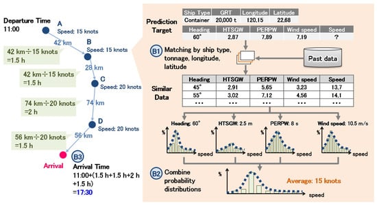 In B2, Bayesian learning is used to derive the probability distribution of the voyage speeds by considering the bow direction and future weather conditions at each site, and the average speed is calculated. The probability distribution is updated on the basis of Bayes’ theorem given in Equation (2).